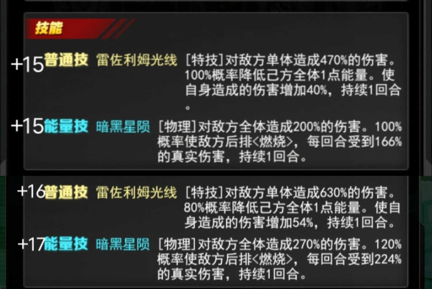 +16普通技雷佐利姆光线[特技]对敌方单体造成630%的伤害。80%概率降低己方全体1点能量。使自身造成的伤害增加54%,持续1回合。