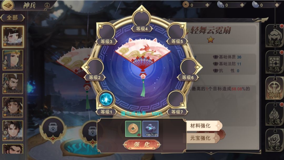 通过消耗一定的材料、元宝或提升卷轴能够强化神兵的等级,神兵的技能、穿戴时能够提供的基础属性提升也将会随着神兵等级的提高而提升。