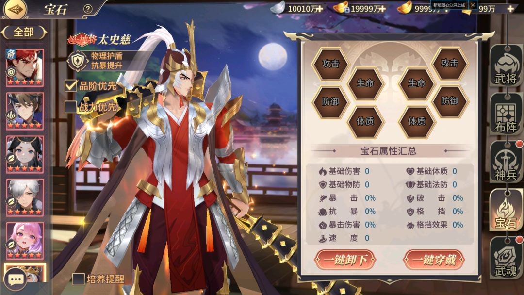 武将系统包含了“武将”、“布阵”、“神兵”、“武魂”、“宝石”功能,该系统将主要用于查看已获得武将、配置队伍阵容以及通过各种方式对武将进行战力提升。
