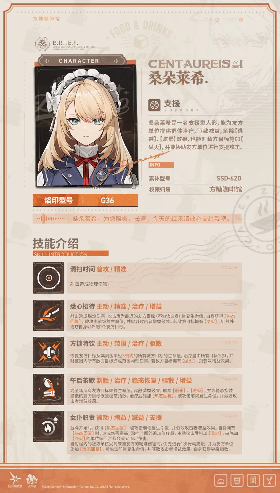 【技能情报】现在为指挥官带来精英人形「桑朵莱希」技能情报!少女前线2:追放发布于 2024-01-19关注尊敬的指挥官,现在为您带来精英人形「桑朵莱希」技能情报!桑朵莱希是一名支援型人形,能为友方单位提供群体治疗,驱散减益,并解除【逃避】、【眩晕】效果,也能对敌方目标施加【溢火】,并协助友方单位进行支援攻击。