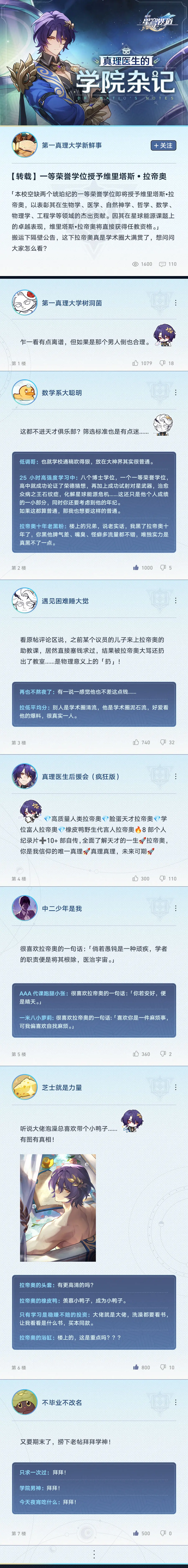 真理医生的学院杂记崩坏:星穹铁道 - 新闻星发布于 2024-01-19关注 真理医生?你是说那位年纪轻轻便荣获八个博士学位、一个一等荣誉学位、独立解决星球能源危机、治愈众病之王「石纹症」的天才吗?他至今还是不可超越的校园传说,我们都称他为「学神」!这不,快考试了,又该拜学神了……