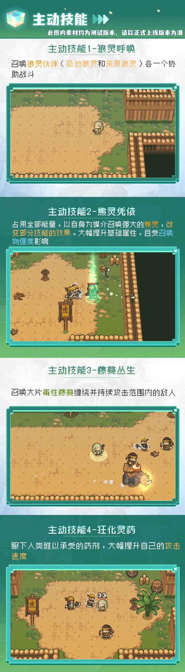 在使用【熊灵凭依】技能后,虽然基础属性大幅提升,但也要注意自身血量,当心被怪物消耗。在进场前,可以先召唤出大型“灵卫”、小型“灵卫”,并使用【狼灵呼唤】召唤出“狼灵伙伴”;接着使用【熊灵凭依】变为熊灵状态并吞下【狂化灵药】发起进攻,间接以【藤蔓丛生】补充伤害。