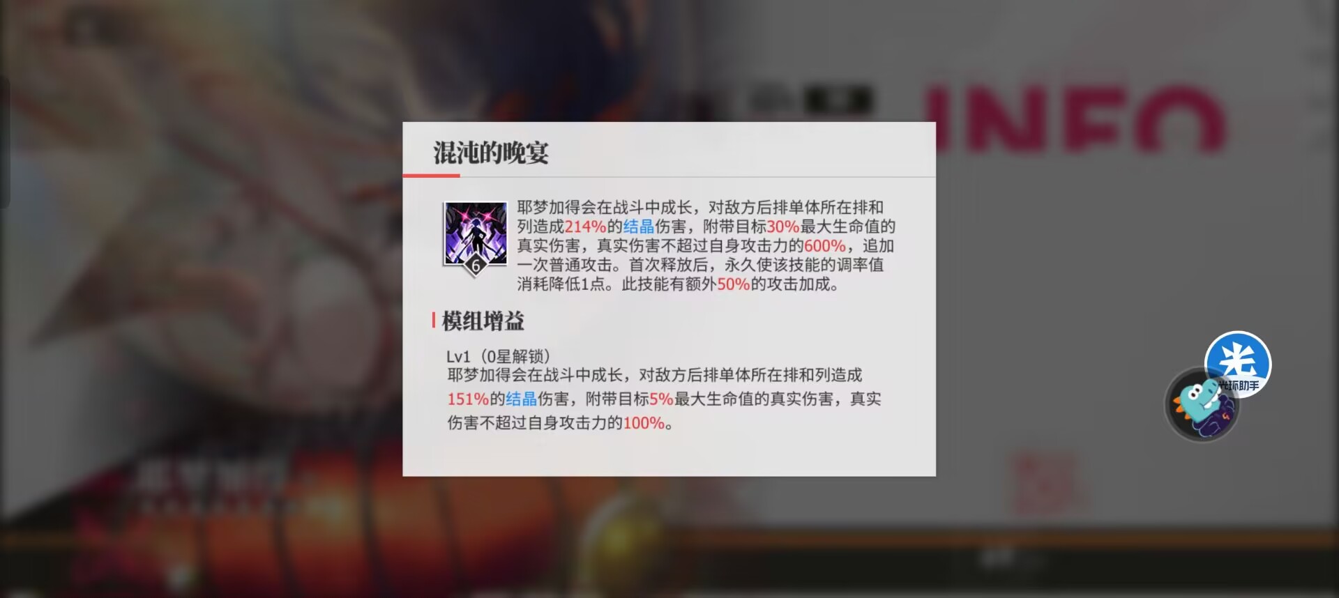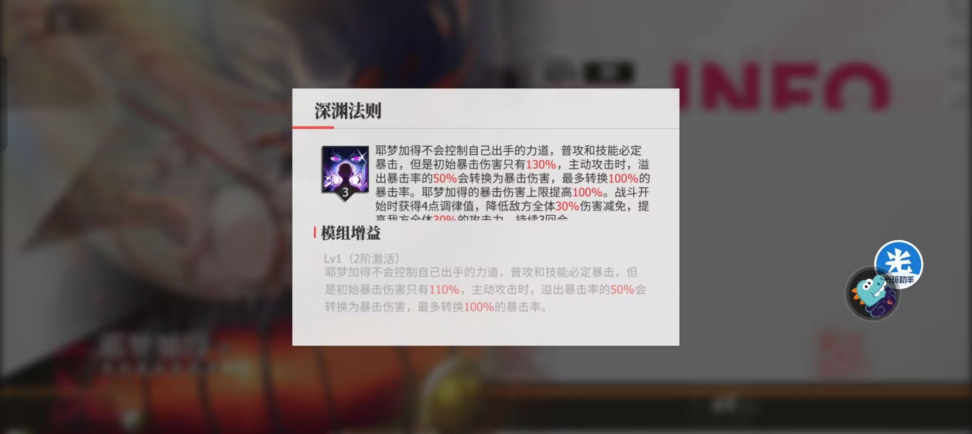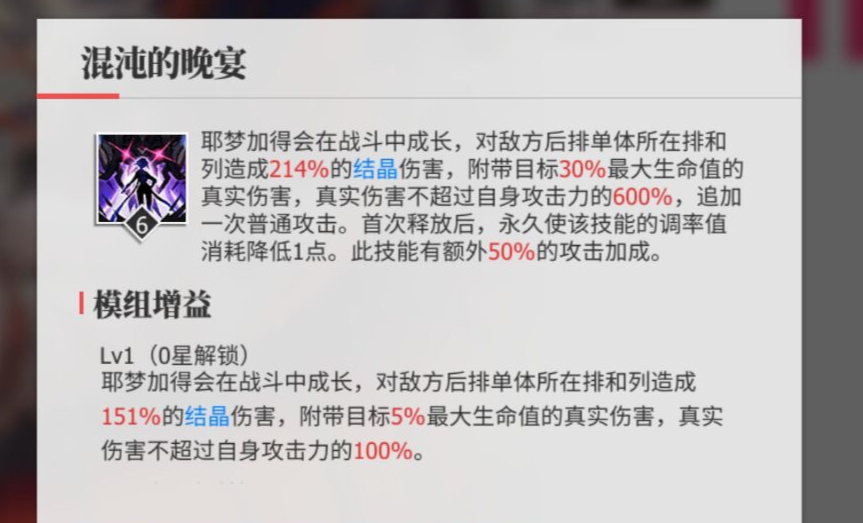 ⭐总结:耶梦加得结合了真伤、必定暴击、同时释放技能可以减少调律值的效果,并且被动还有加攻和减敌人伤害的效果。