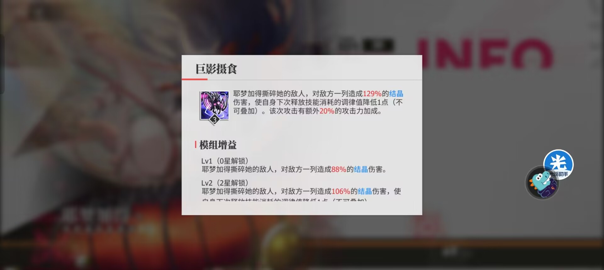 ①耶梦加得普攻为:【巨影摄食】。对敌方一列造成88%的倍率伤害。满级可以造成129%的倍率伤害,同时可以让自身下次释放技能的调律值降低。