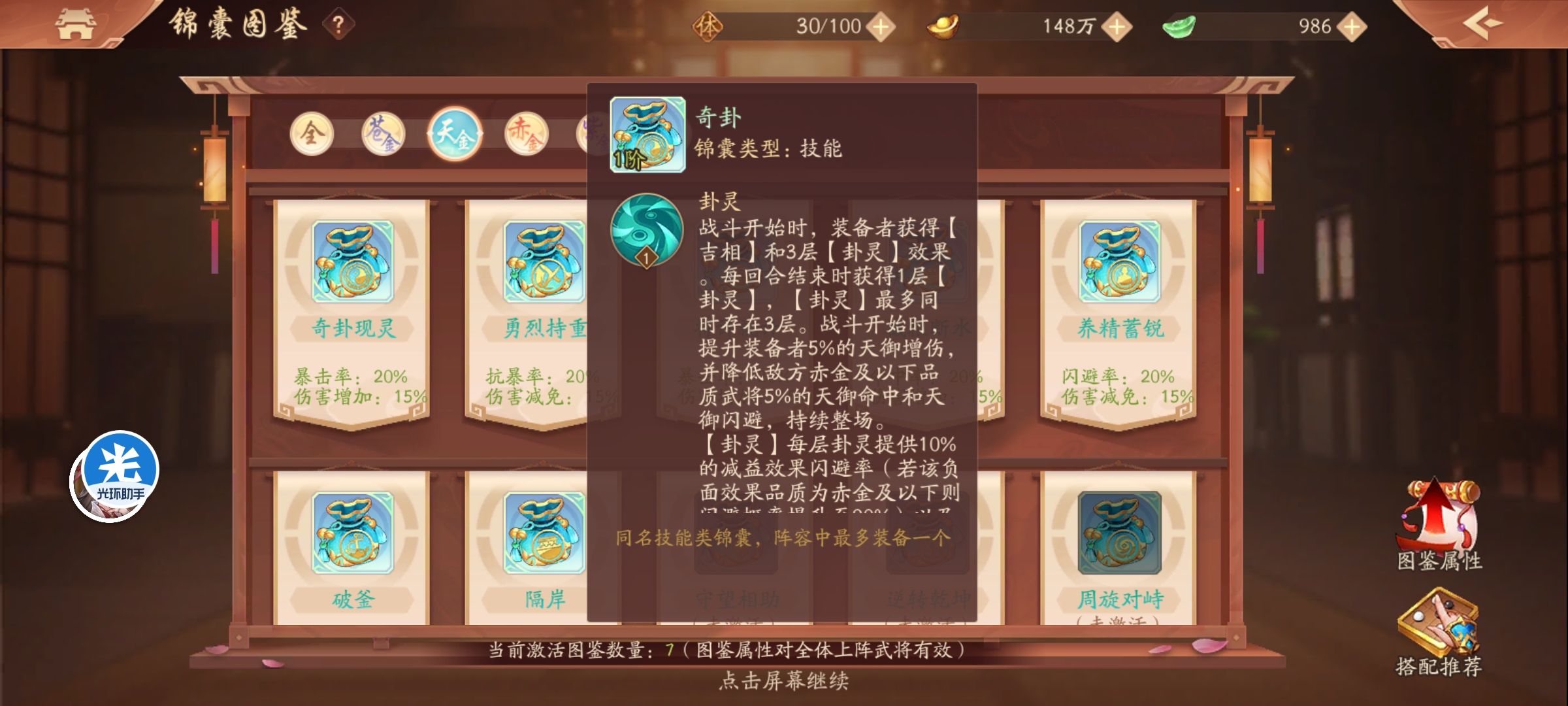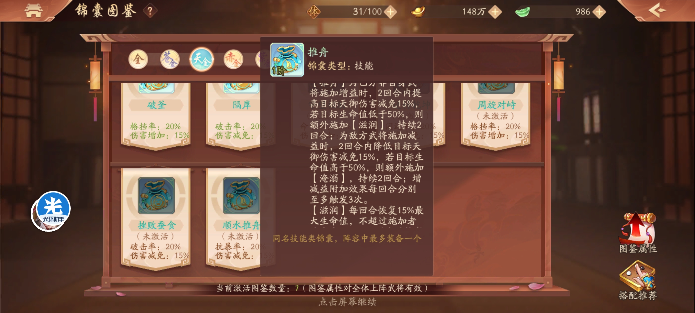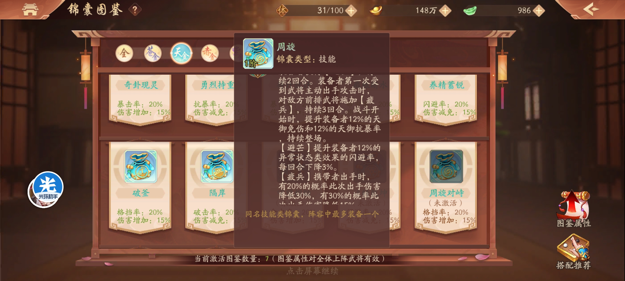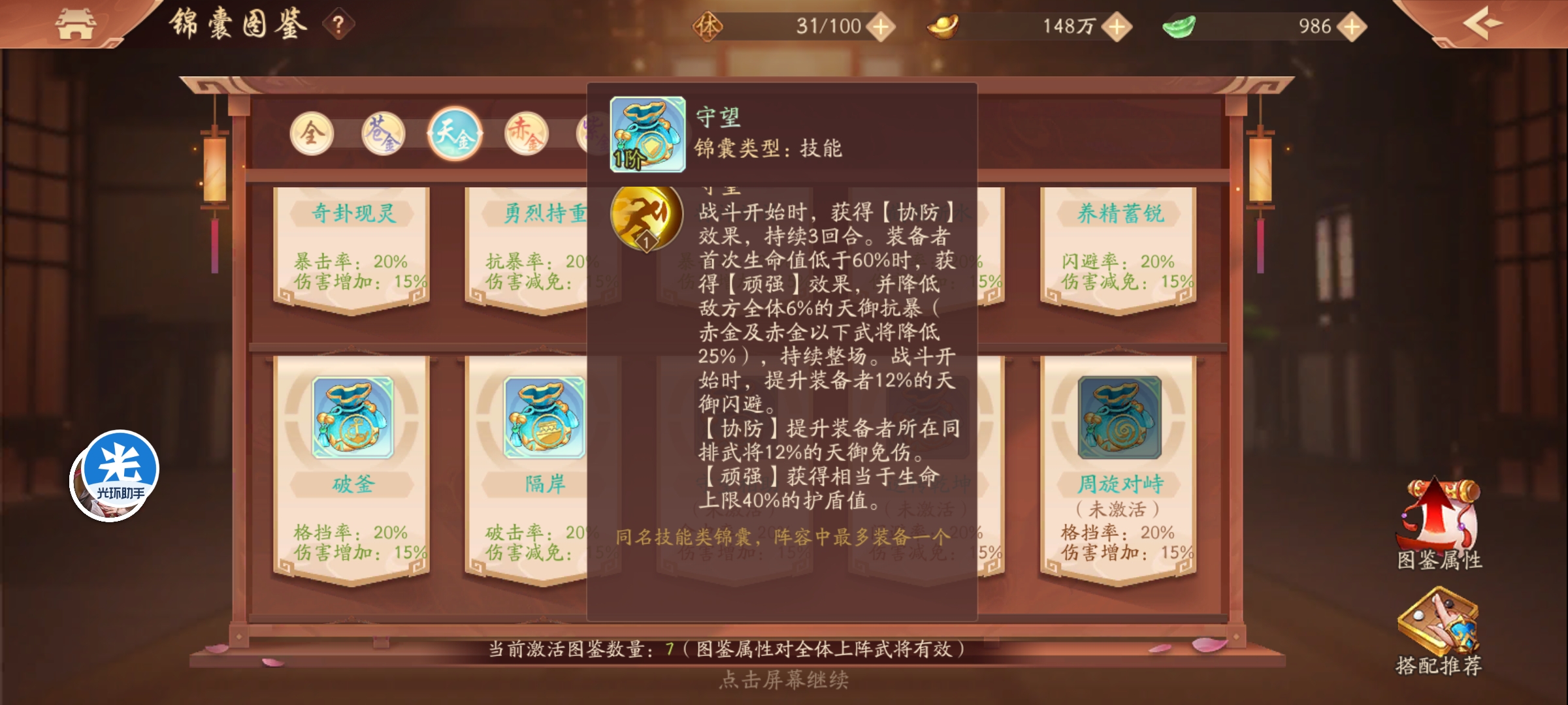 提升天御免伤、抗暴率和异常闪避率,降低敌前排出手伤害。这个锦囊明显策划不走心,技能有重复。没其他的时候过渡用,有好的就换下来。