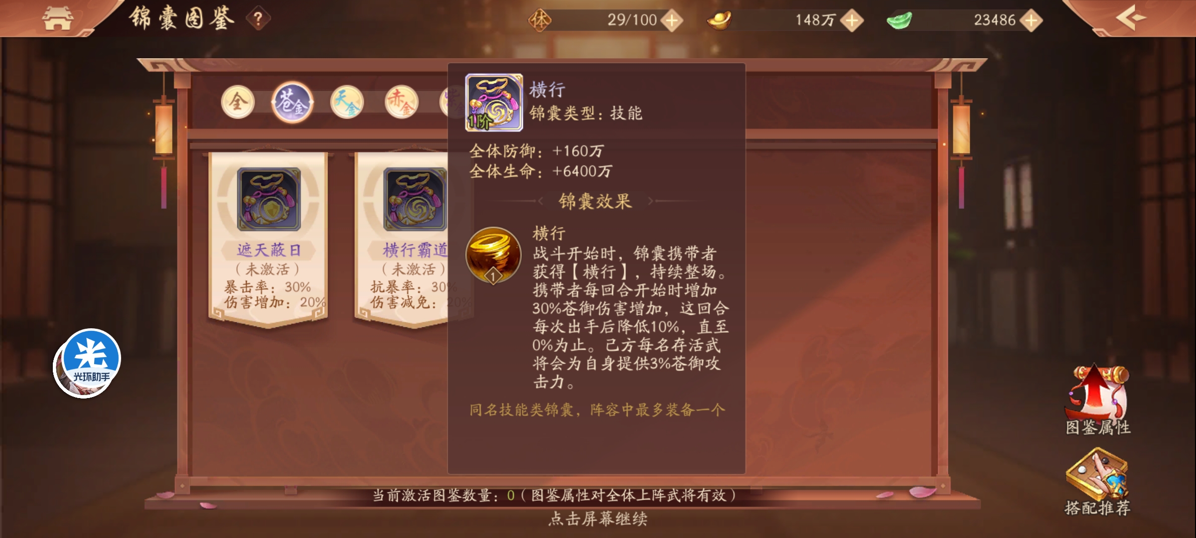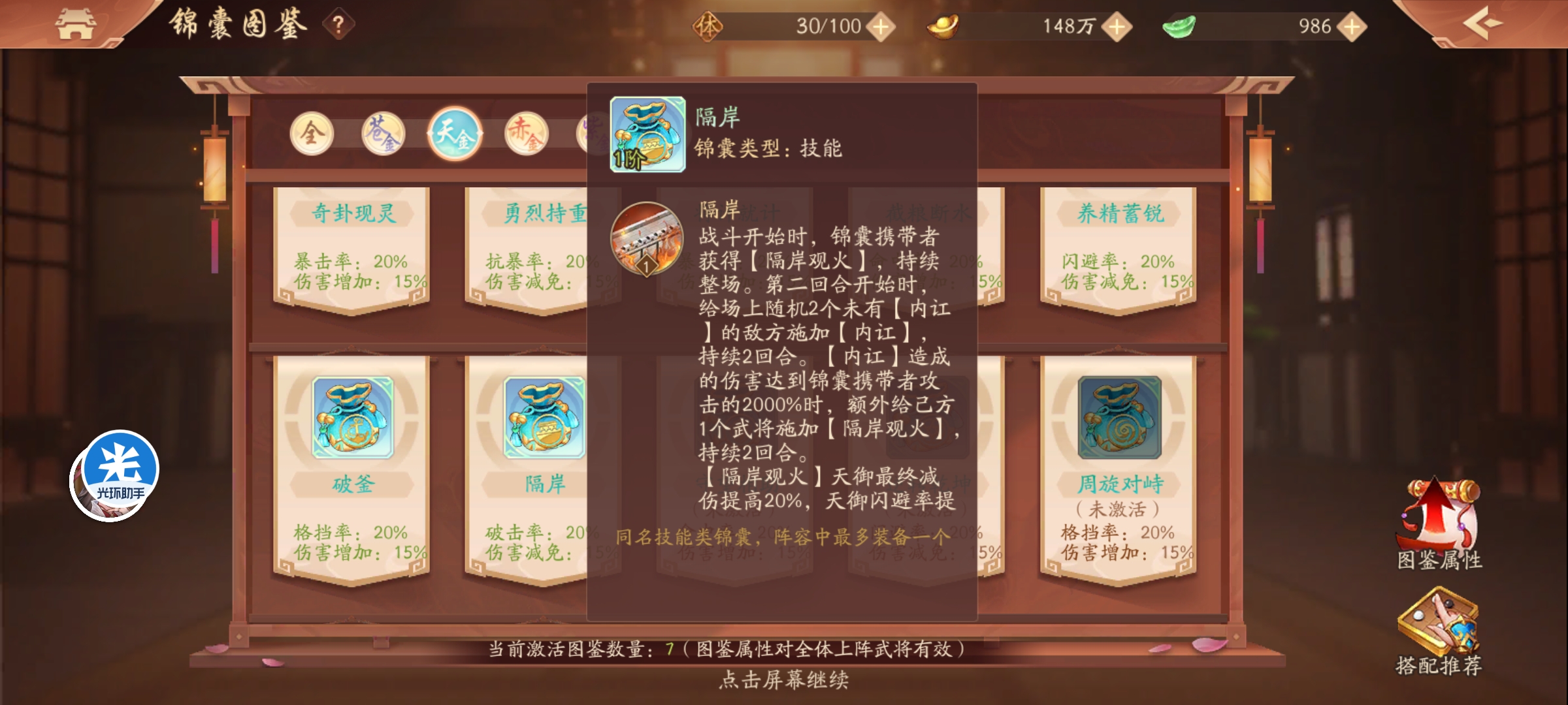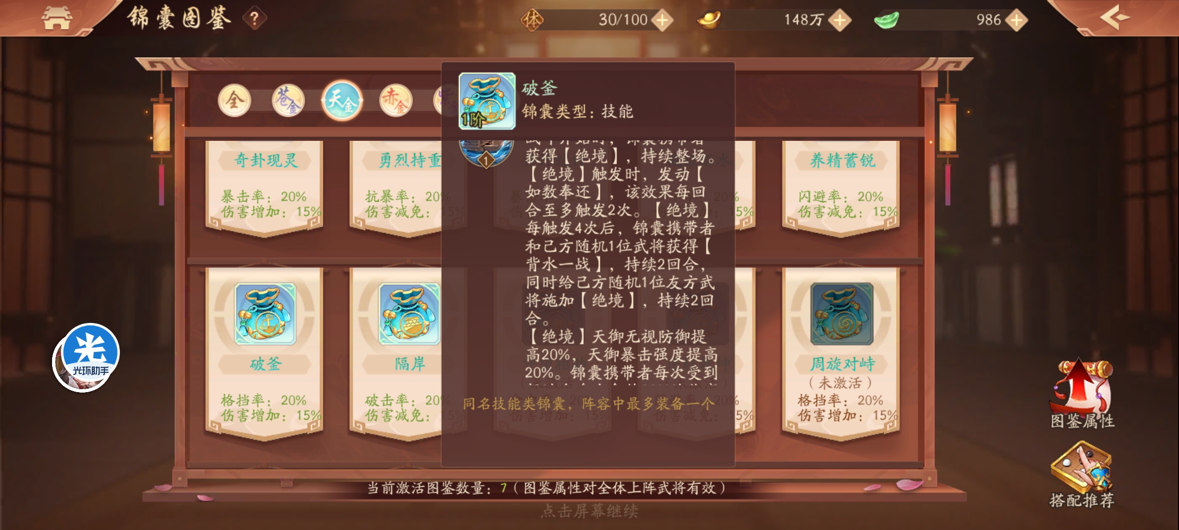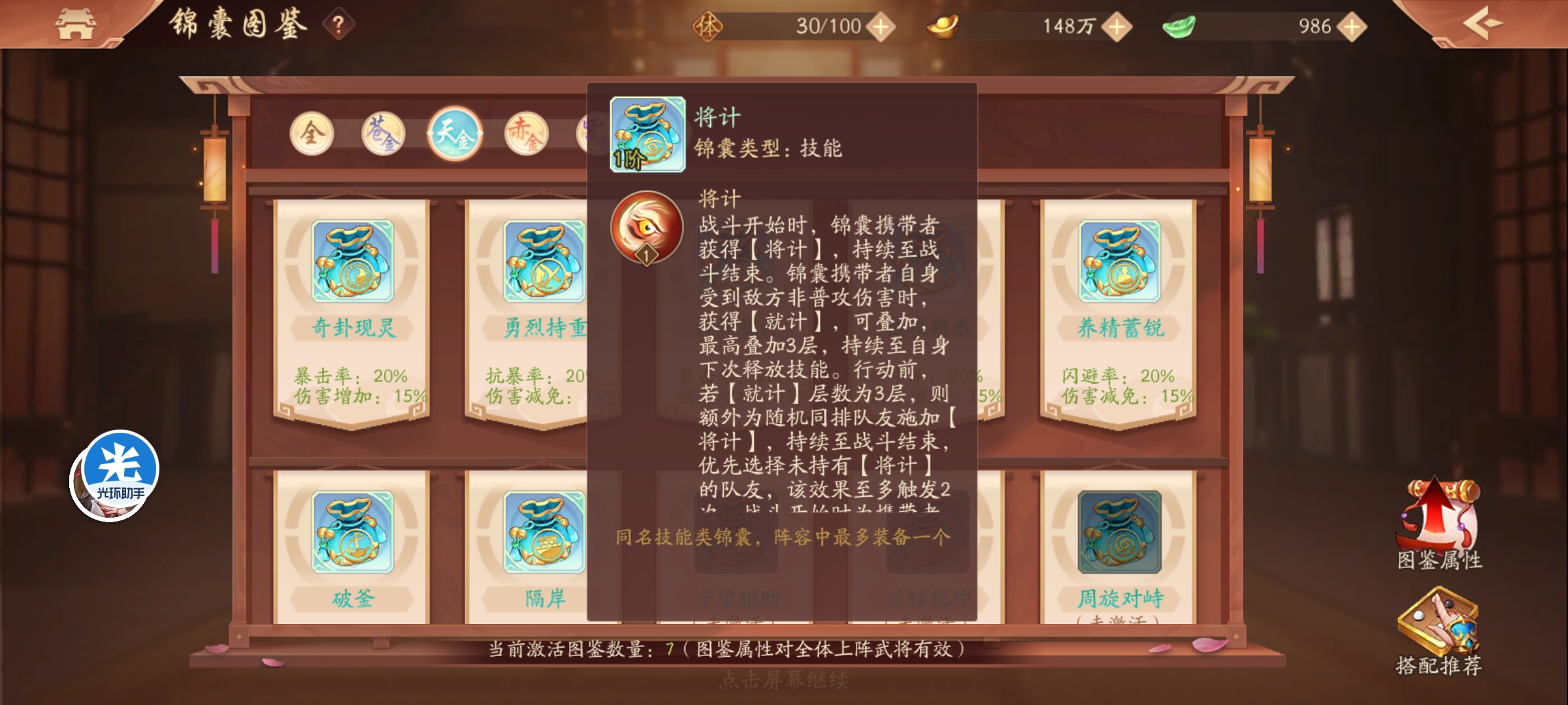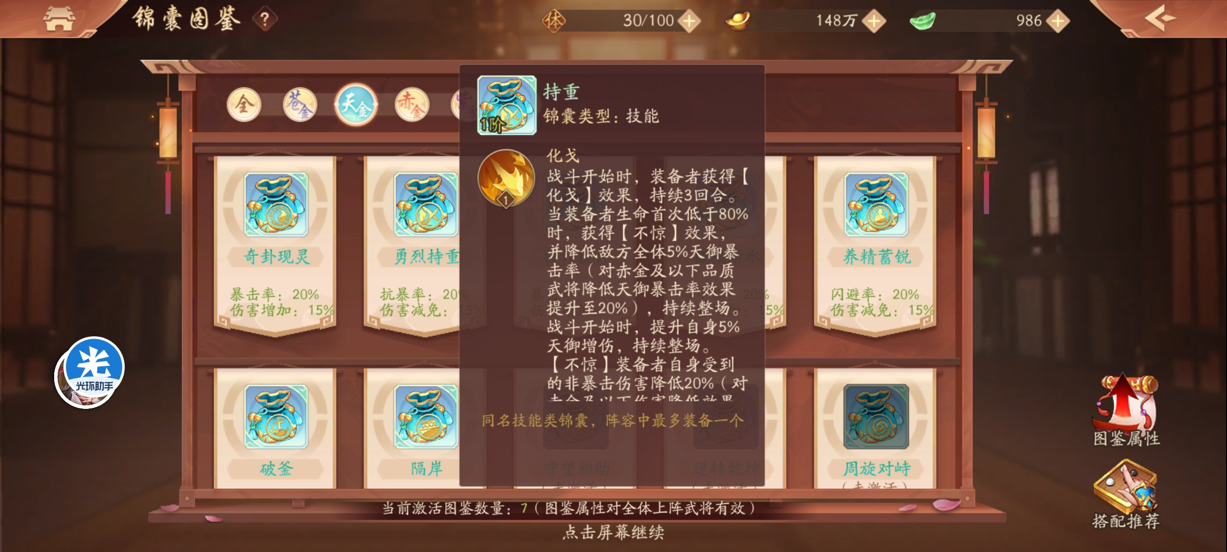 提升天御免伤、抗暴率和异常闪避率,降低敌前排出手伤害。这个锦囊明显策划不走心,技能有重复。没其他的时候过渡用,有好的就换下来。