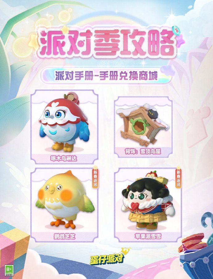 派对手册福利多多:专业森林医生“啄木鸟琳达”萌趣登场,“小香风套装”、“猫头鹰欧维”外观、“大白鸽乔治”外观全新来袭,更有新春限定商店上线——“鹦鹉芝芝”和“苹果派雪雪”惊喜回归!