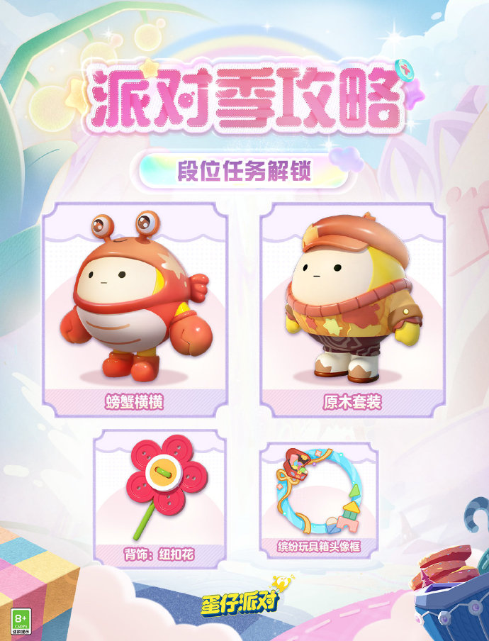 段位任务解锁好礼:“原木套装”简约上线,还有配饰“纽扣花”与“缤纷玩具箱头像框”一同上新~鹅蛋蛋位以上的蛋仔参与5场巅峰赛,还可获得全新外观“螃蟹横横”!