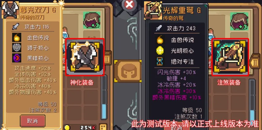 神化后的装备或注煞过的装备在装备外框及装备角标上会与其他普通装备有所不同,村长在这里给小骑士展示一下: