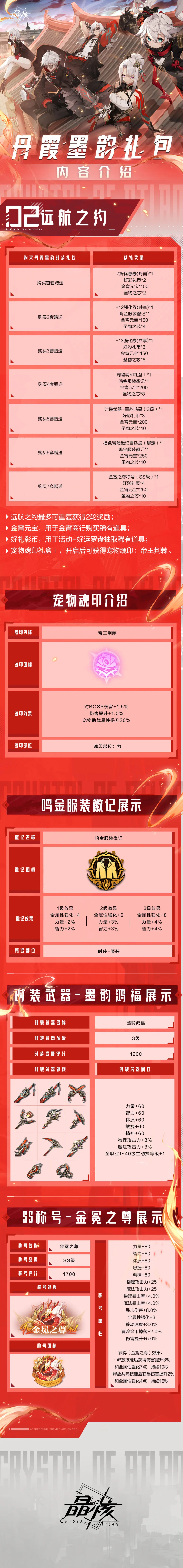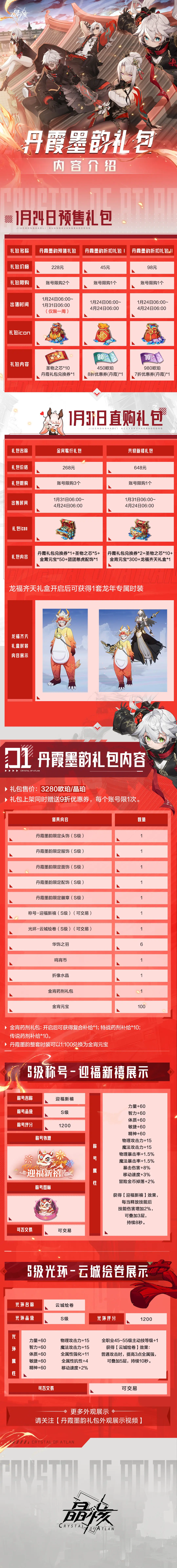 礼包预览丨丹霞墨韵礼包内容介绍光环资讯 - 综合发布于 2024-01-24关注彤色的霞光斑斓绮丽,搭配上山水画般的泼墨意蕴,终于制成这幅极具泊垣风格的绘卷。丹霞墨韵礼包内容详细介绍、远航之约奖励明细来啦!外观展示视频也即将揭晓哦~「丹霞墨韵预售礼包」「丹霞墨韵折扣包」将于1月24日(本周三)更新后上架。「丹霞墨韵时装礼包」将于1月31日更新后上架,全新SS级称号、SS级武器装扮来袭。本期春节爆料,小兔为冒险者们带来丹霞墨韵礼包的全部内容详情,希望冒险者们喜欢~