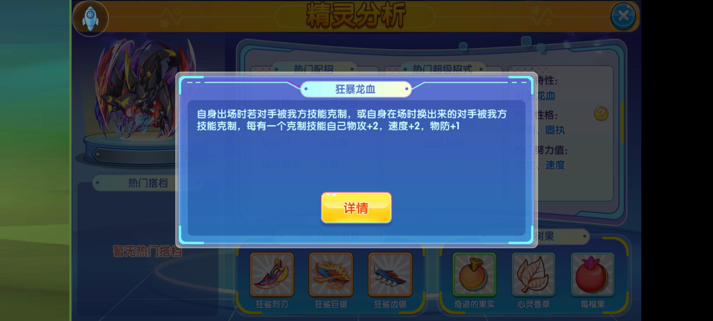 烈咬陆鲨Φ形态有五个特性:适应力,坚硬爪子,自信满满,无防御和狂暴龙血。当然前四个可以忽略,详细看下狂暴龙血:出场时若对手被自己某个技能克制,或自身在场时换出来的对手被自己某个技能克制,自己物攻+2,速度+2,物防+1,下场重置能力等级。 1、不论是同时战场,还是后上场或者对方切宠,都有机会进行一次狂暴龙血的判定;2、触发狂暴龙血判定与地龙属性龙、地面无关,而只有自身携带技能属性有关。当然正常配招都会带着这双本的,最重要的一点,这里的自身携带技能,并不仅限于攻击技能,一样包括变化技能,凭借这一特性就给了地龙带来了更多的玩法。