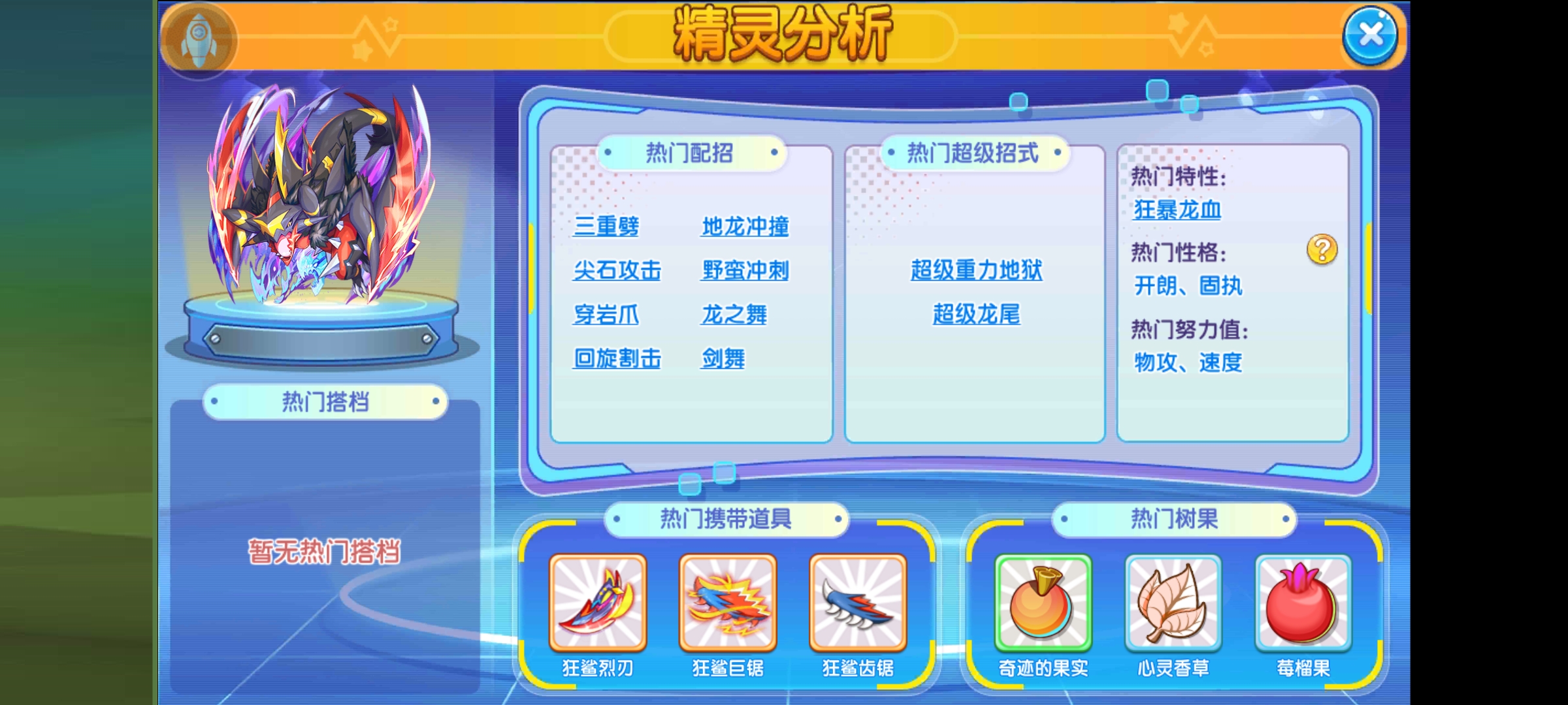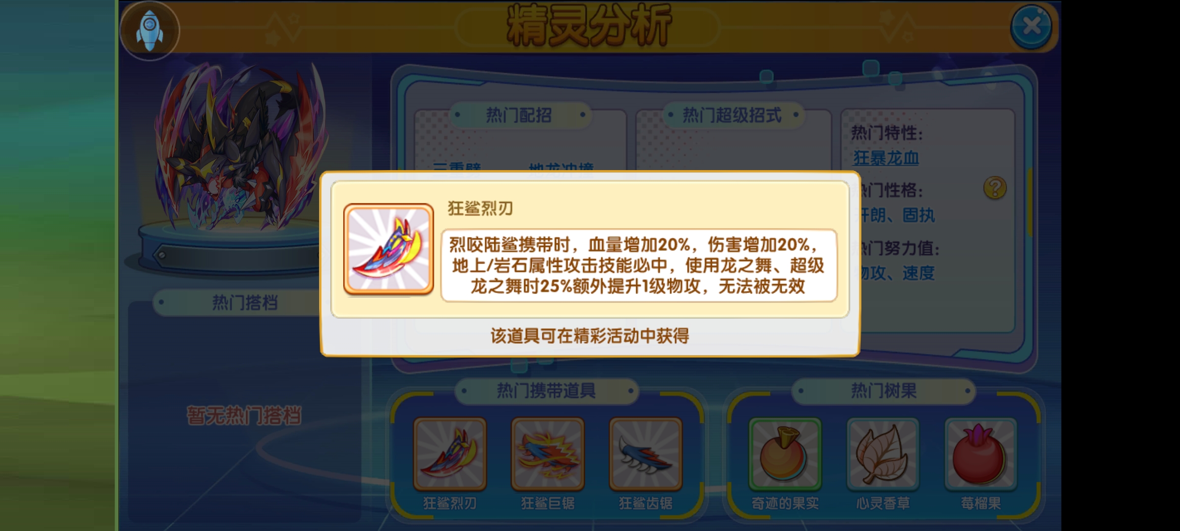 真专属—狂鲨烈刃:烈咬陆鲨携带时血量增加20%,伤害增加20%,地上/岩石攻击技能必中,无法被无效。 这是开朗地龙最好的携带物,最大特点就是无法被无效,岩石攻击技能必中配合尖石攻击打出伤害。另外使用龙舞提升物攻,这个就忽略了,因为没有考虑龙之舞、超龙舞的技能,地龙特性已经在给强化了,这时候带更暴力技能或者龙尾打破对方阵型效果更好。我看到也有不少极限输出地龙-固执带限定打收割,但在中级对决中开朗的游击地龙更加好用些。