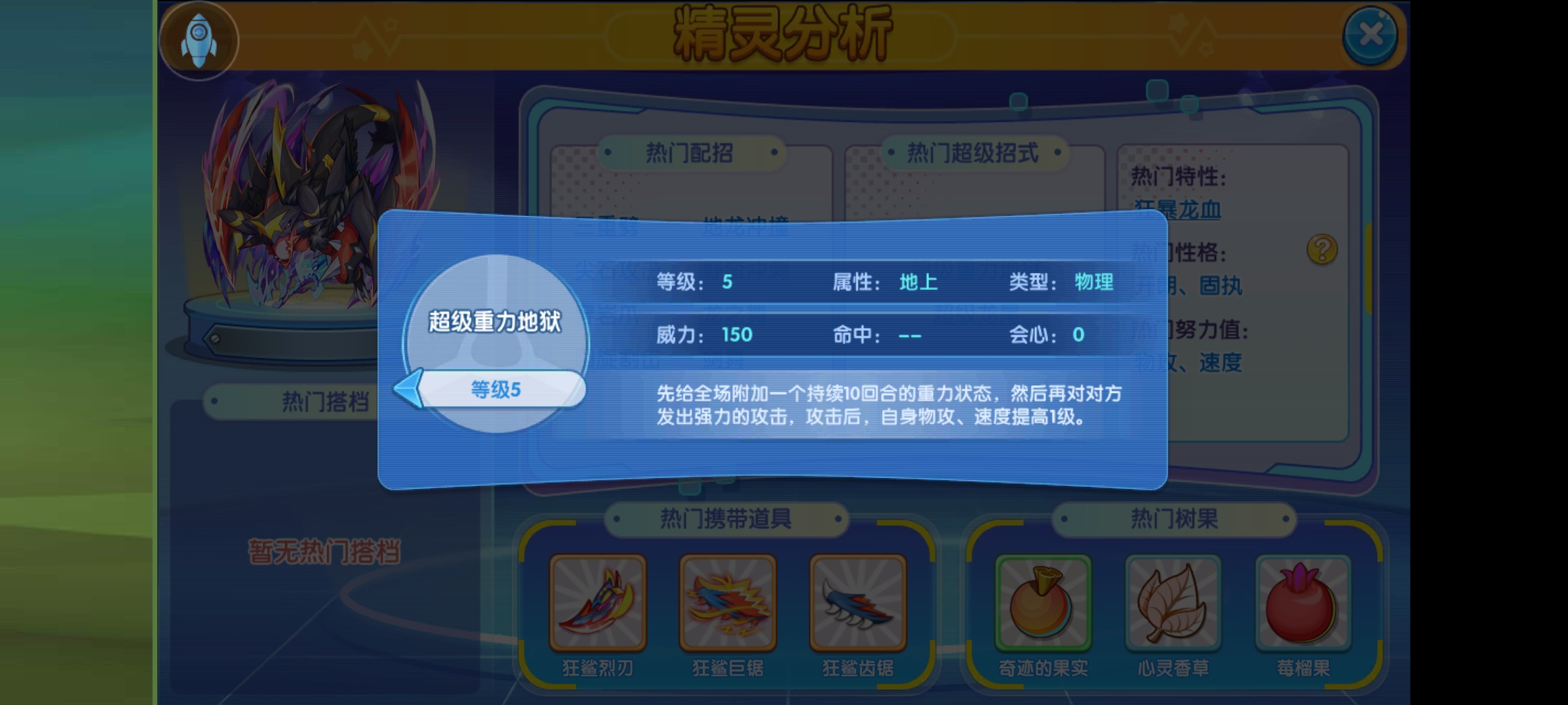 超级重力地狱:这个技能提升攻速外,给场上附加10回合的重力地狱,这个超级招式有两个功能,一是打游击时迅速处理掉对面的飞在天上的联防、骚扰精灵,二就是收割比赛,150的强力威力加上强化,收割场上残余精灵,配合钉子效果更好。