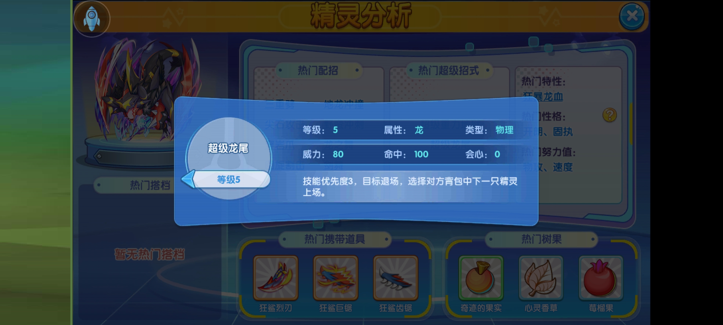 超级龙尾:可以说是绝对的先手了,也是大家很熟悉的招式,作用就是逼退精灵,逼退对面已经强化的精灵。