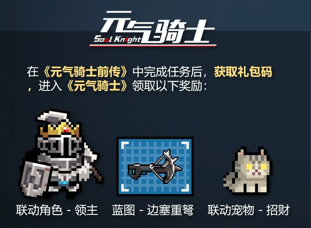在本次联动活动中,小骑士们前往《元气骑士前传》游戏内完成任务,即可获得《元气骑士》相关奖励;