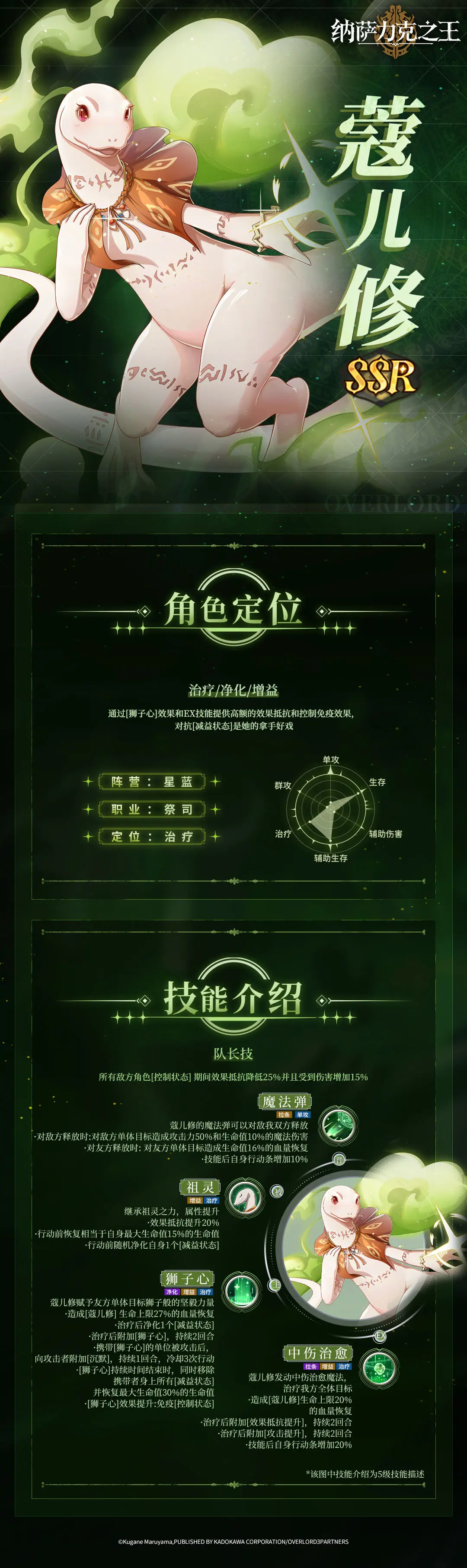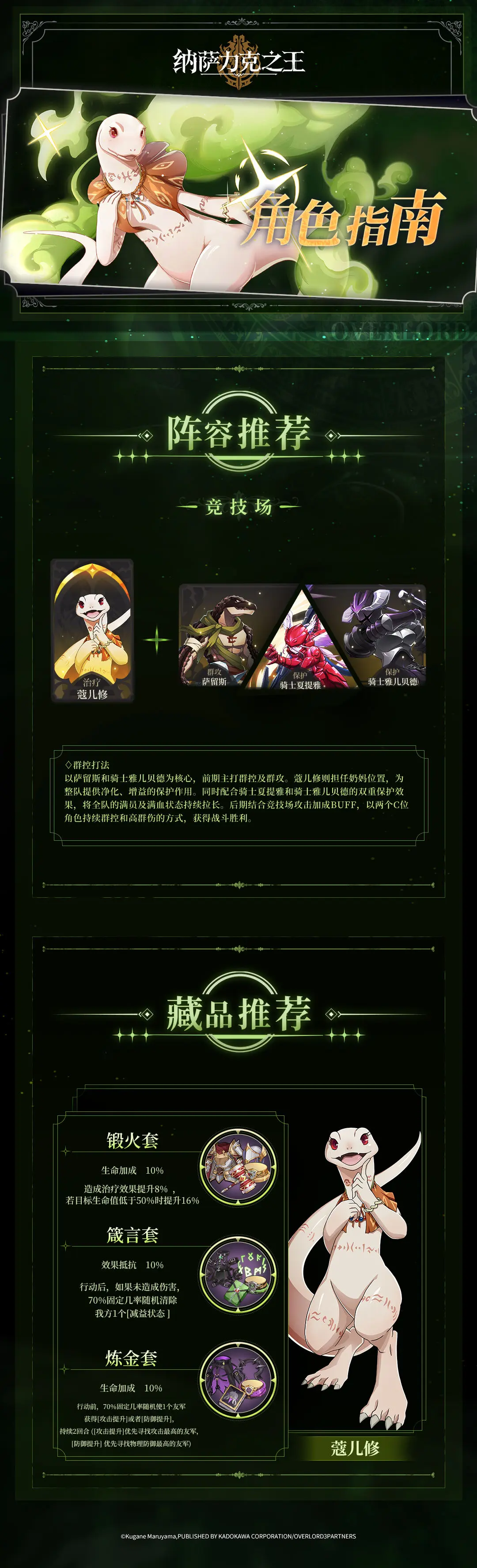 【纳萨力克角色档案】-蔻儿修光环资讯 - 二次元发布于 2024-01-27关注“我是朱瞳族的代理族长,蔻儿修露露。”全身覆盖着白雪般鳞片的蔻儿修是朱瞳族蜥蜴人的代理族长。作为少见的白化蜥蜴人,因为拥有特殊才能而赢得部落成员的信任。掌握了祭司的能力,能够使用第魔法来支援与治疗同伴进行战斗。今天给大家介绍的是OVERLORD正版授权手游《纳萨力克之王》将会出现的角色——「异色治愈者」蔻儿修, 更多角色等待解锁中!大家敬请期待~