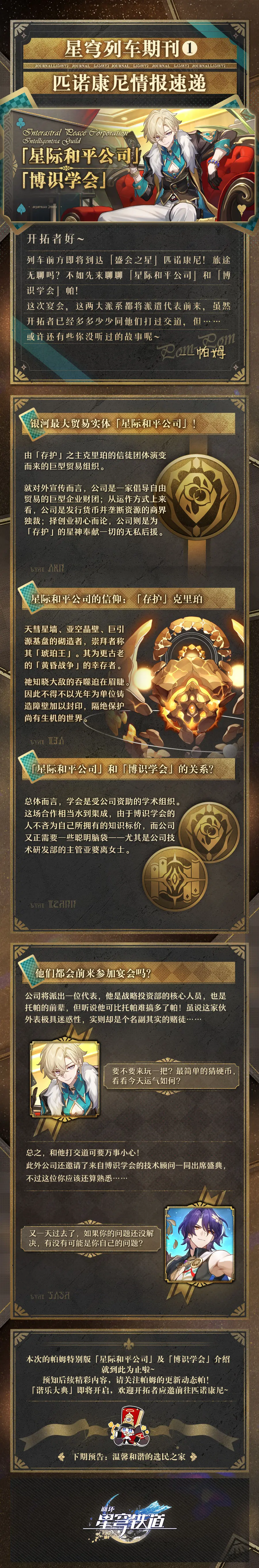 「星穹列车期刊 | 匹诺康尼情报速递」崩坏:星穹铁道 - 新闻星发布于 2024-01-27关注 前方即将到达「盛会之星」匹诺康尼!路途漫漫,就让帕姆先给开拓者介绍一下此次宴会来宾的背景,做一些必要的科普帕!关于「星际和平公司」和「博识学会」,也许你了解的还不够多…