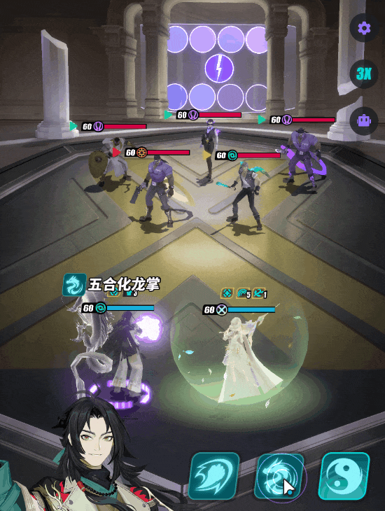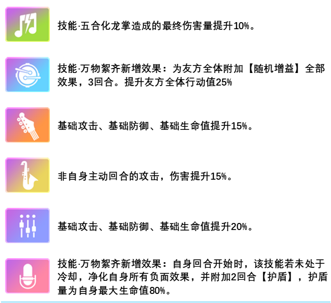 展开领域【山泽通气】,持续3回合。获得【行地无疆】2层。使用五合化龙掌追击敌方。为友方全体附加【随机增益】全部效果,3回合。提升友方全体行动值25%。被动效果:波次开始时,我方全体获得获得【乾坤轮转】。冷却回合:4山泽通气(无法驱散)友方造成伤害时恢复生命值,恢复量为伤害的 30 %。友方基础技能每次造成伤害时,附带目标 2% 生命值上限的额外伤害,不超过自身攻击力 100%。乾坤轮转(无法驱散)使用技能时,获取—个【随机增益】3回合;若为基础技能,伏羲获得1层【行地无疆】。(反击行为不会触发)行地无疆(无法驱散)友方被附加【眩晕】或【睡眠】时,立刻消耗 2 层并净化。上限 8层。【山泽通气】期间:友方使用基础技能后,消耗2层使用龙吟破空追击。(每回合1次)随机增益【攻击提升】、【速度提升】、【暴击伤害提升】