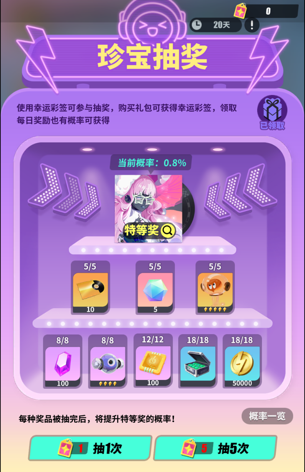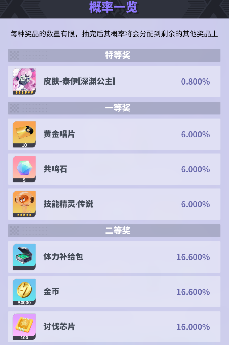 每种奖品被抽完后,其概率将会分配到剩余的其他奖品上,可提升特等奖的获取概率。幸运彩签:在购物中心购买部分礼包可获取幸运彩签。