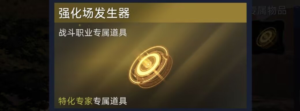 专属道具为【强化场发生器】使用后可以强化30米范围的队友减少技能冷却,大幅度提升弹夹容量和换弹速度,而且在效果的转态下如果击杀敌人,时间还会延长。
