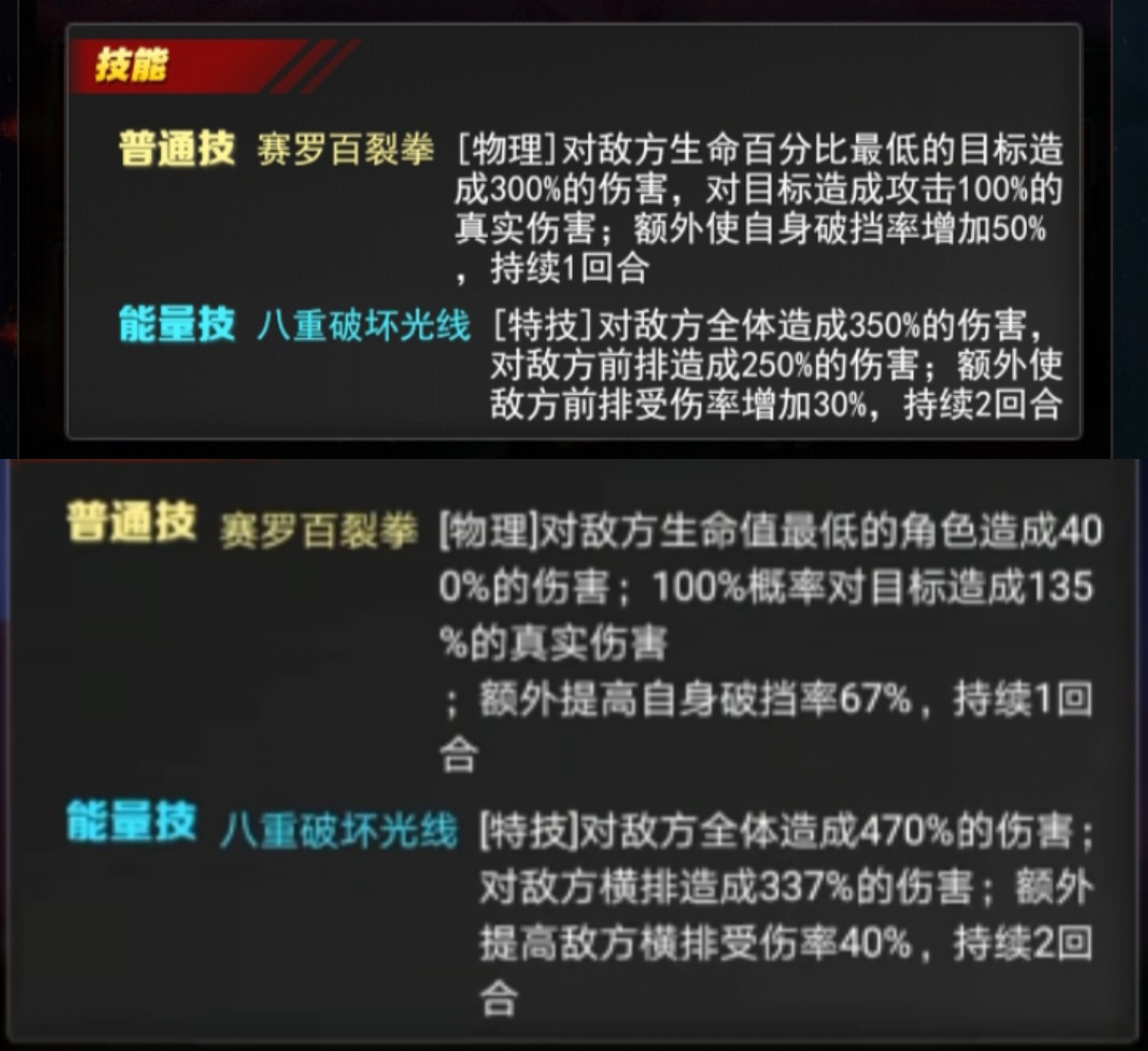 能量技八重破坏光线【特技]对敌方全体造成470%的伤害;对敌方横排造成337%的伤害;额外