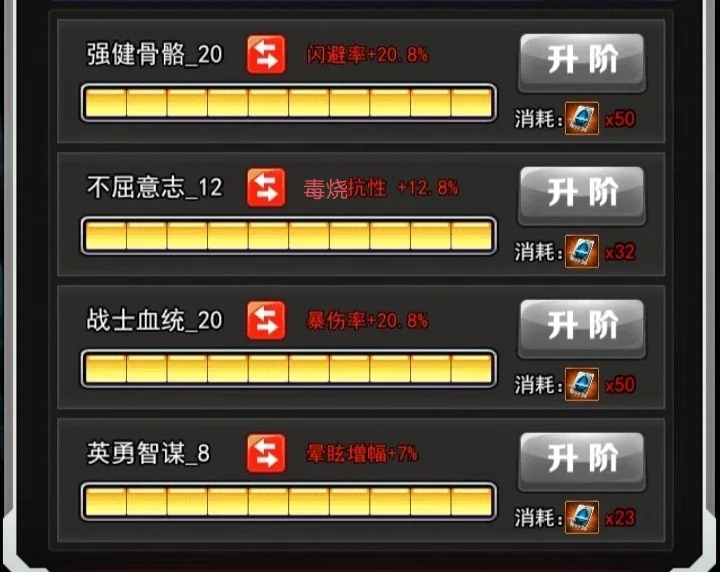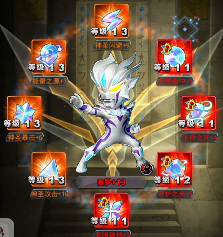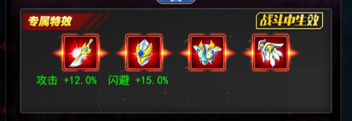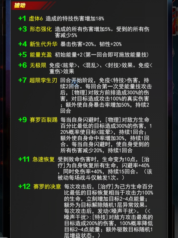 解析:每当自身闪避时,对敌方生命比最低的角色造成300的伤害,高概率眩晕,这个也是一个控制的效果,这个无限赛罗闪避率是不怎么高的,只有超限赛罗闪避绿才可以叠加起来,闪避叠加不起来就很难造成闪避而且进行反击的效果,所以闪避的话在修炼中一定要搞高一点,还会增加命中率,这个命中率可有可无,因为也不怎么高智商,降低20%上海这个反击是很不错的,毕竟带有控制效果,但是这个控制效果得是命中人之后才可以触发这个控制
