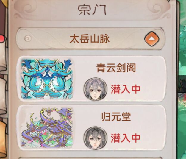 一:了解【潜入宗门】。宗门散布在每个地图中,比如太岳山脉的两大宗门:【青云剑阁】和【归元党】。
