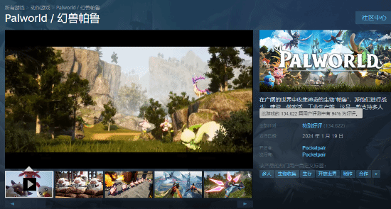 《幻兽帕鲁》Steam评价超10万条!好评率94%资讯驿站发布于 2024-01-29关注《幻兽帕鲁》已发售10天,目前其Steam评测已超过10万条,达到了10.34万条。整体口碑仍为“特别好评”,好评率94%。 目前游戏尚处抢先体验阶段,存在不少影响游玩体验的问题,但官方也表示在积极修复,未来的更新路线也已公开。