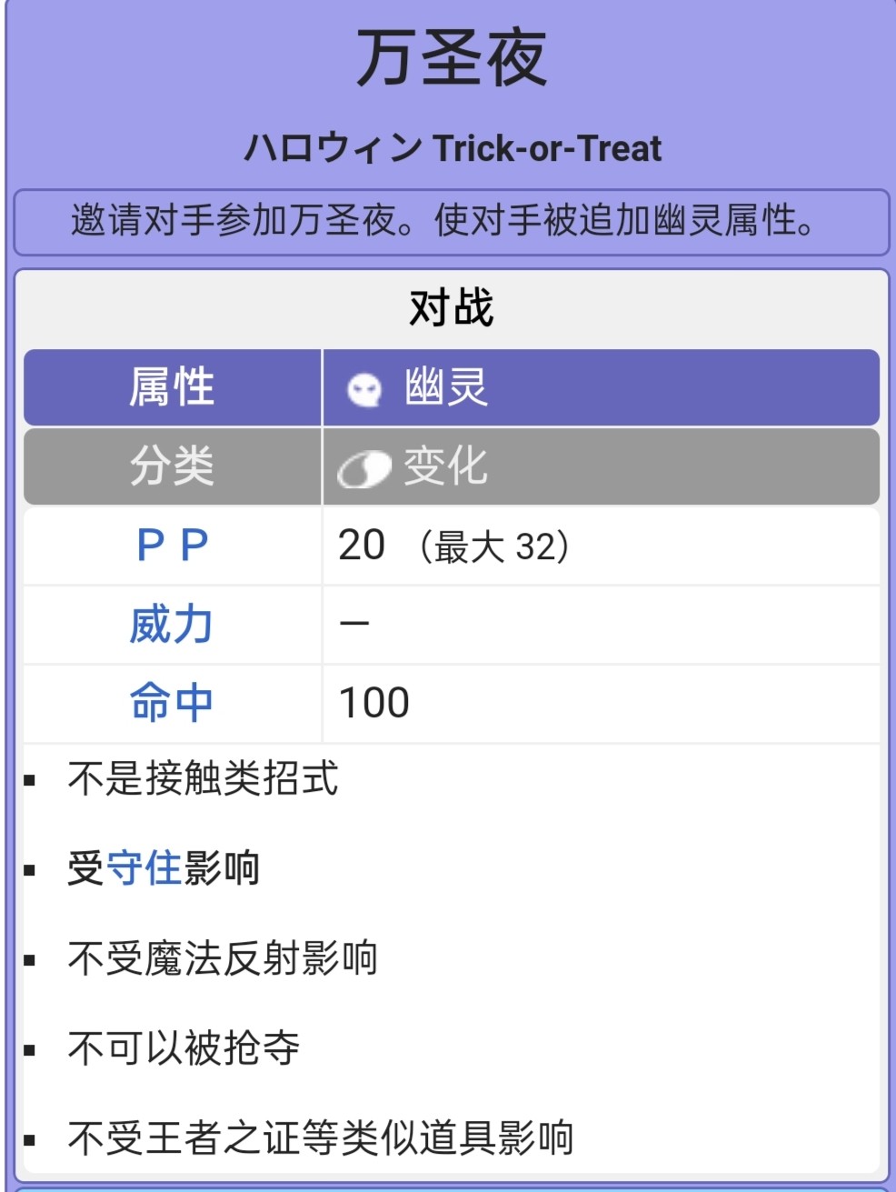 这个并不是翻译故意教程这样的,而是这个日文原称就叫ハロウィン Trick-or-Treat,直接翻译过来就是万圣夜,它的作用是邀请对手参加万圣夜。使对手被追加幽灵属性。属于变化技能,可惜复刻中还没正式更新这个技能,只是留了个位置。