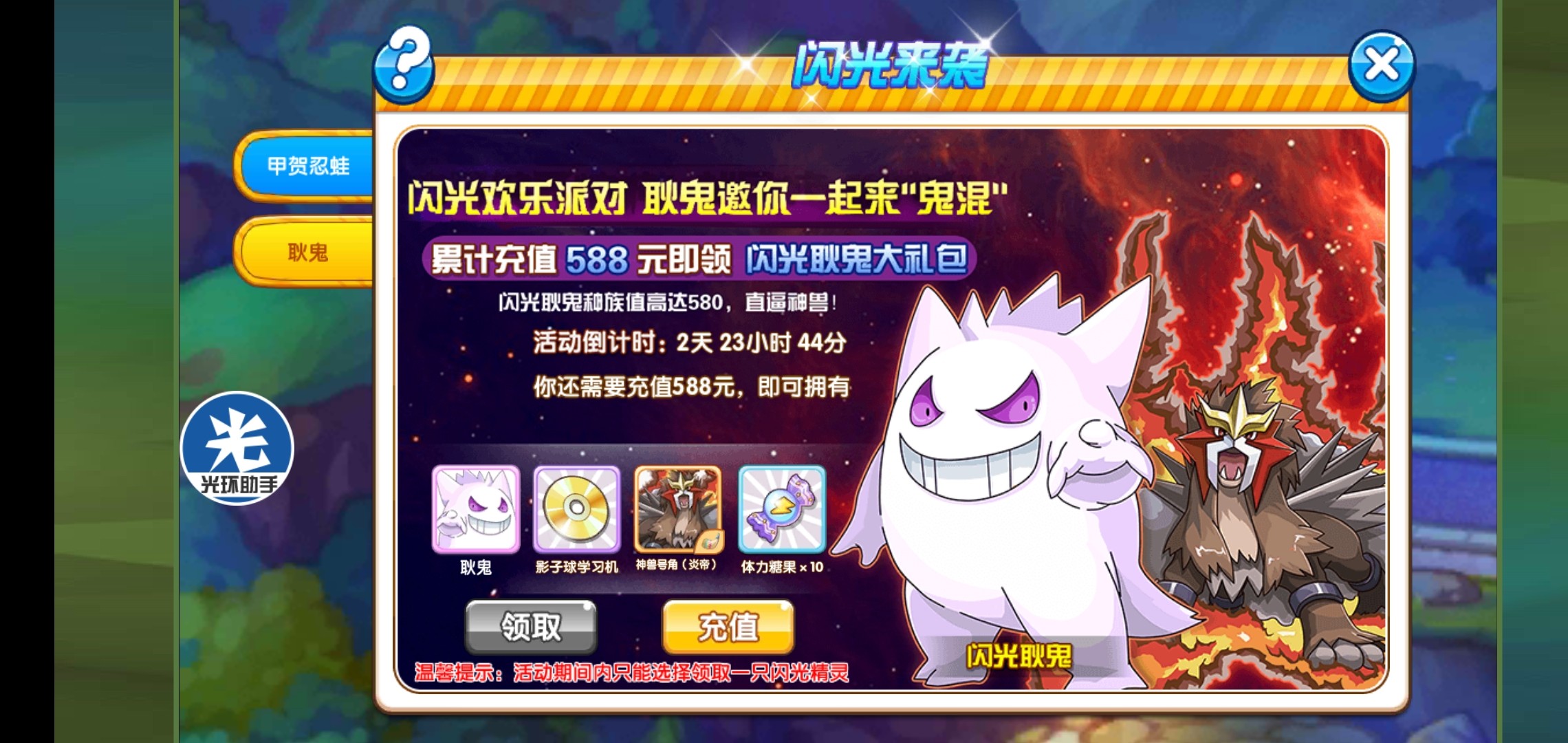 闪光的复刻价值588,也是比较早的氪金闪光的,但是它为什么一直要个炎帝号角绑定到一块卖?这个我实在搞不懂,也没发现它两有什么关系,如果知道的玩家还请留言给我说下。🤔🤔🤔