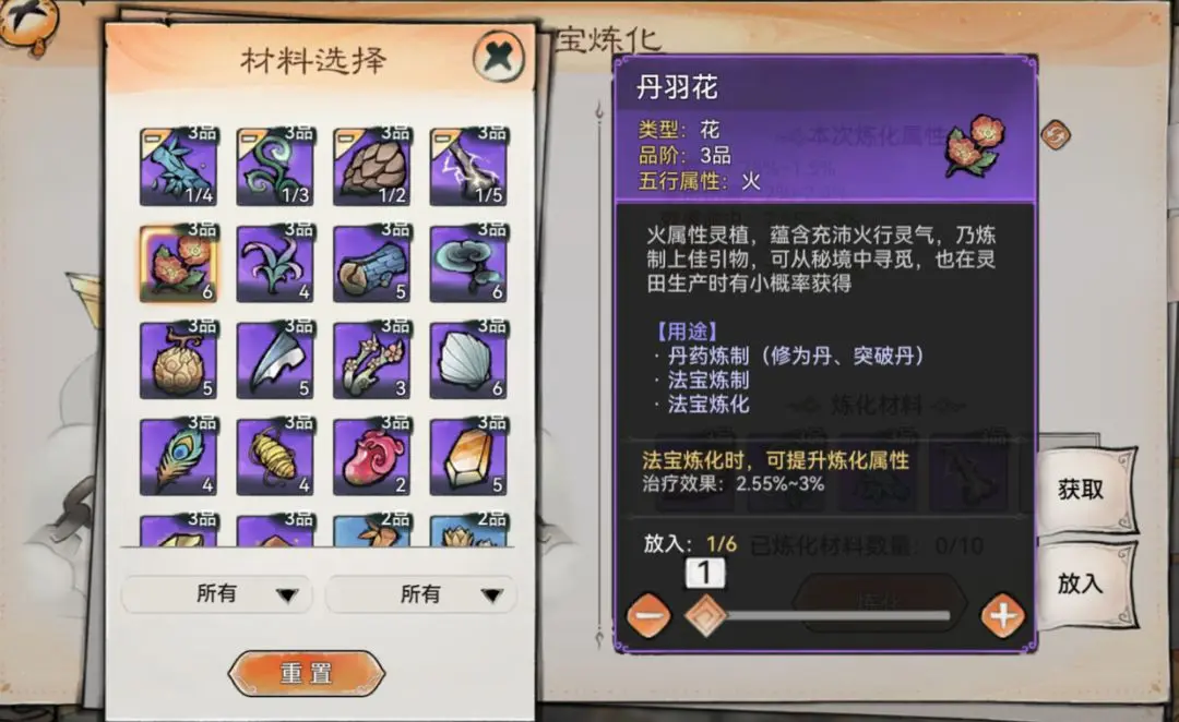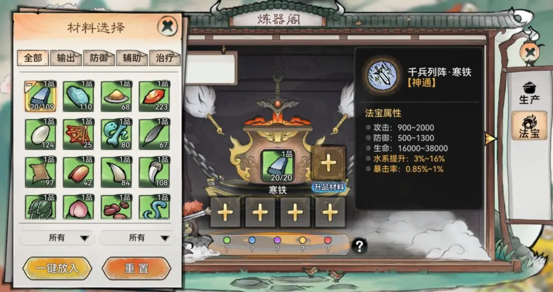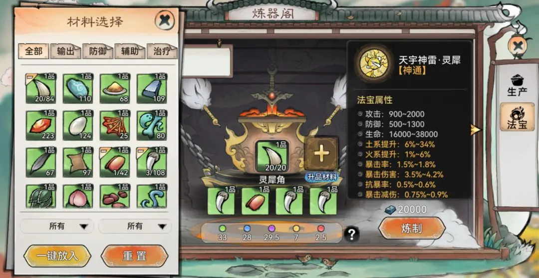 这么强大的法宝自然需要各种天地灵材才能炼制而成,主材料将会影响法宝炼制而成的技能,副材料将会影响法宝所带来的加成属性。