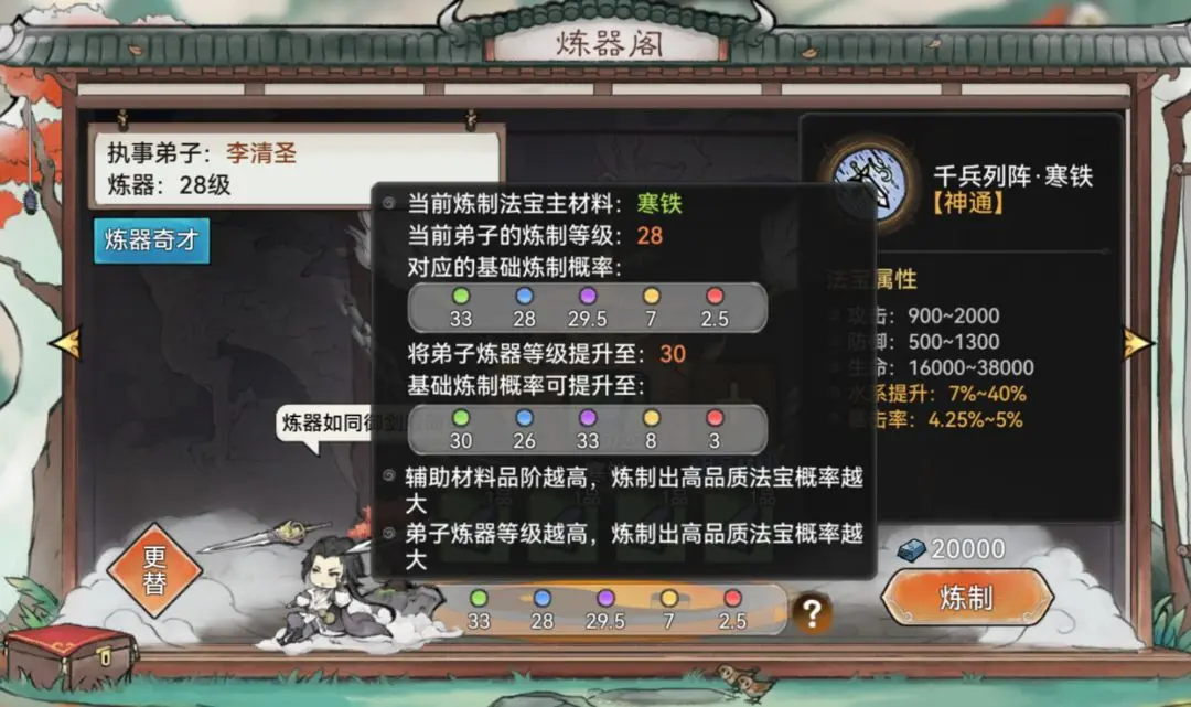 法宝的品质各有不同,高品质的法宝炼制成功率相对较低。不过祖师老爷不用担心,法宝的品质与炼制法宝弟子的炼器等级紧密相连。同时辅助材料的品阶越高,炼制出高品质法宝的概率越大。除此之外,小清瑶还听闻有一种名为灵露的神秘物品,能够提升炼制高品质法宝的成功率。这种灵露在仙盟商店有售,但数量稀少,获取不易。
