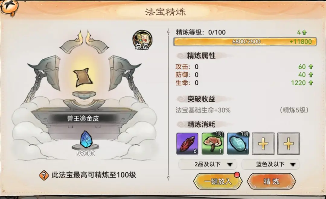 法宝养成法宝的强大之处不仅在于神通技能,更在于可以通过不断精炼,大幅提高法宝的属性。精炼到一定程度后需要消耗星尘石英突破,经过突破后,法宝将获得极大的突破收益。幸运的是,星尘石英这种晶石在仙盟商店可以购得。