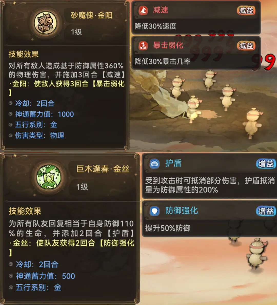 又例如金阳砂和金丝木这两种防御类型的法宝,虽然同为金属性,但金阳砂更适合输出型前排弟子,而金丝木则更适合在需要提供护盾和回复的情况下给前排弟子使用。