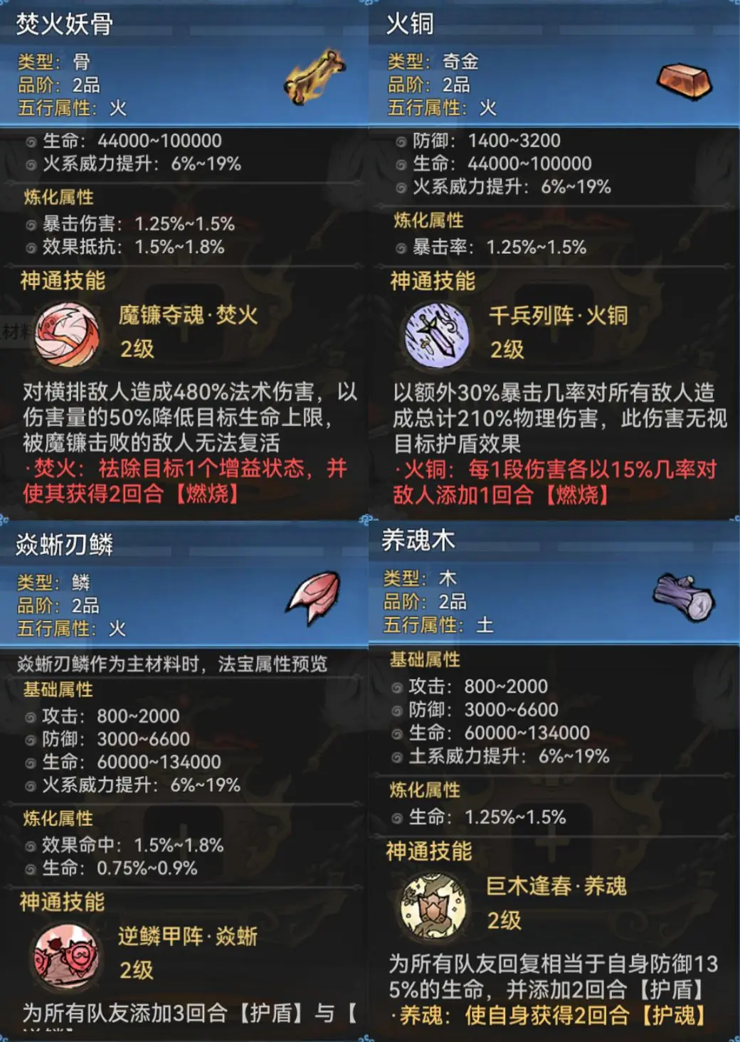 对于剑修来说,追求的理想法宝目前是焚火妖骨和火铜,这两种法宝能够为剑修带来极具爆发力的神通技能。而对于辅助弟子,焱蜥刃鳞和养魂木是更为适合的选择。这两种法宝都能为弟子提供护盾。焱蜥刃鳞还具备攻击强化效果,增强弟子的攻击力;而养魂木则能回复生命,并在2回合内提供护魂效果,为弟子提供额外的保护。