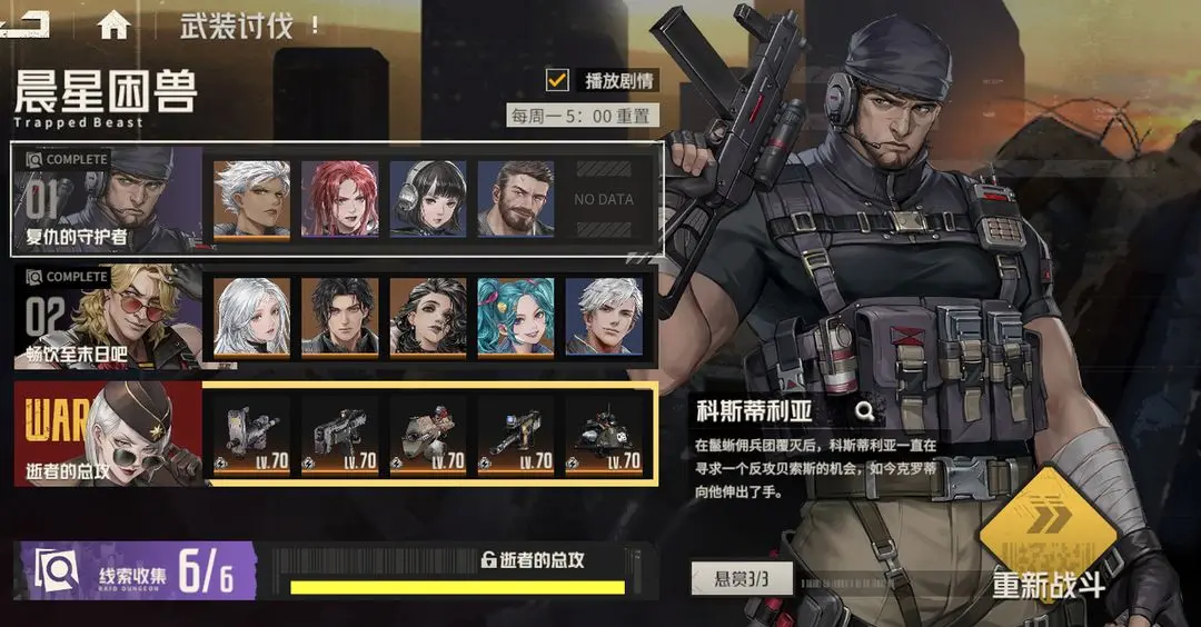 - 每周一5:00进行重置。重置后,已通关关卡可通过“突入战斗”进行扫荡