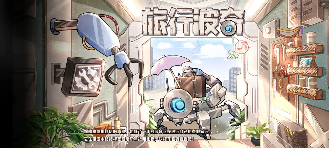 - 结束了一整年的工作,波奇去旅行啦,活动期间,指挥官每日可选择波奇的旅行地点,并收到波奇寄来的礼物;完成全部旅行,可获得包括节日限定徽记、A级机兵走鹃、招募凭证,转运许可、纯晶在内的各种奖励。