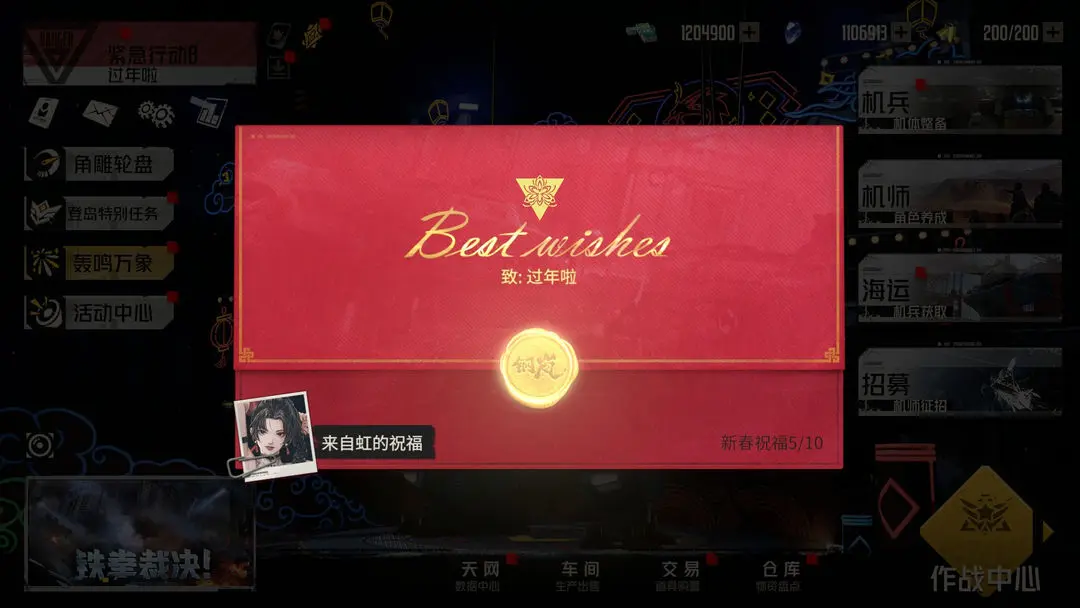7.「新春祝福」活动将在2月8日5:00-2月22日4:59开启;活动期间,指挥官每日可收到来自机师的新春祝福,并获赠88-128区间的随机纯晶奖励,共计十封信件。考验手气的时候到啦!