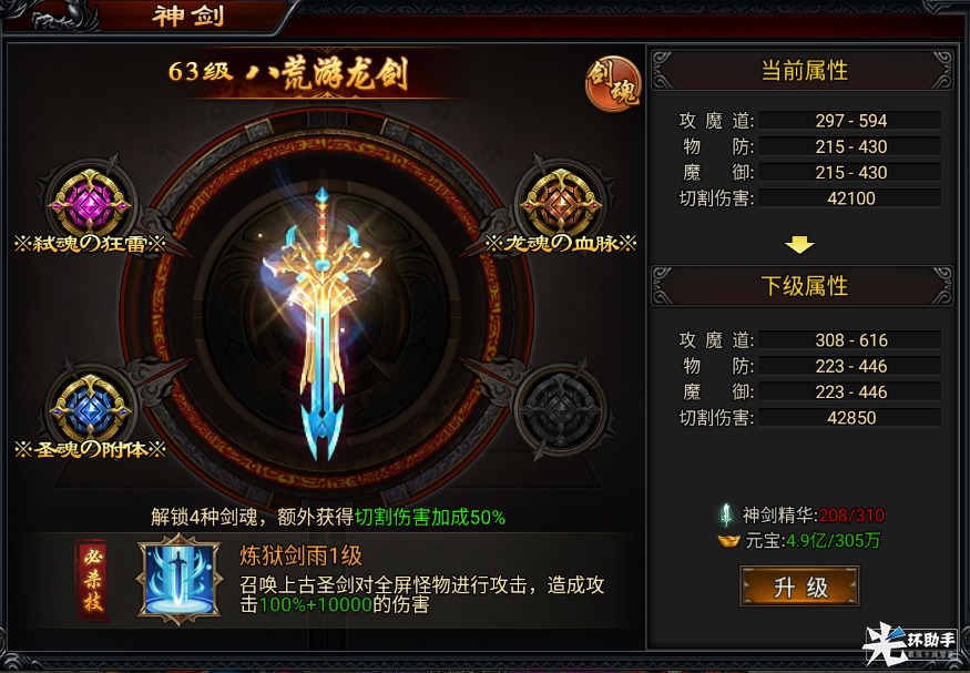 必杀技:炼狱剑雨,召唤上古圣剑对全屏怪物进行攻击,造成攻击100%+ 10000的伤害