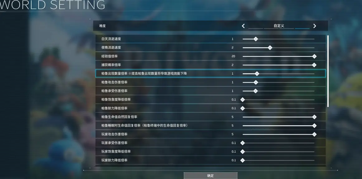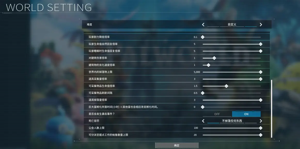 关键的几个设置:经验倍率、耐力倍率、捕获概率倍率、玩家承受伤害倍率、游戏内掉落物上限、死亡惩罚、可分配帕鲁数量、可采集物品生命值倍率(根据材料营地效率调整 调太高可能砍颗树都要半天)