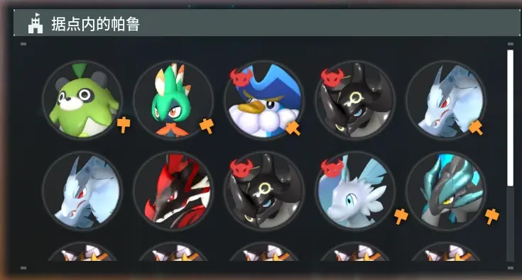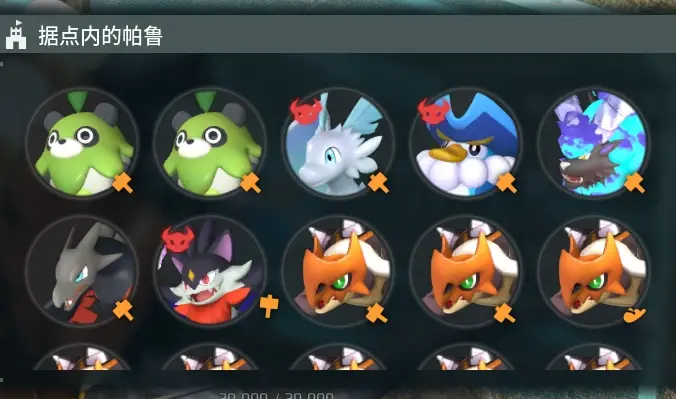 基地内前期以碎岩龟为主 中后期换成霜寒兽 最后换成魔渊龙+焰煌毕业(如图是我前期的2个副基地工作帕鲁)