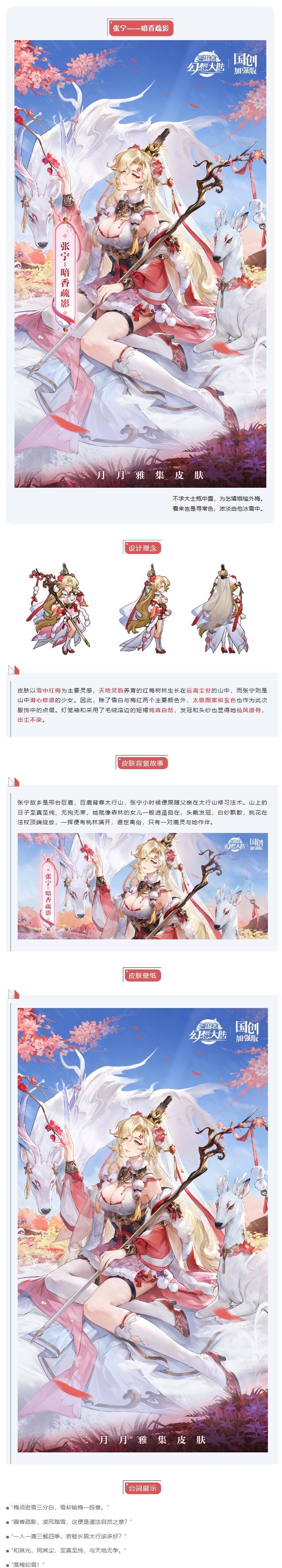 皮肤鉴赏丨2月月雅集皮肤张宁「暗香疏影」即将上线!光环小G发布于 2024-01-31关注暗香疏影,凌风踏雪!香香又来爆料了!张宁月雅集皮肤会在2024年2月1日正式上线!今天先来欣赏一下这款全新的皮肤:张宁——暗香疏影。