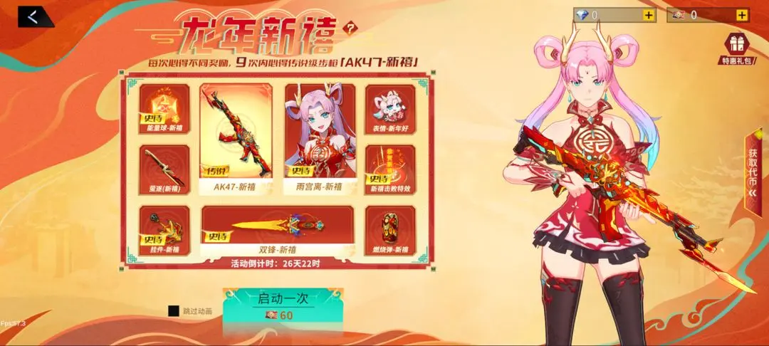 活动内容:在龙年新禧中,使用能源卡片启动抽取程序。每次抽取必定获得龙年新禧的一件物品。启动抽取程序所消耗的能源卡片逐渐递增。9次内必定获取传说品质的主手武器「AK47-新禧」!