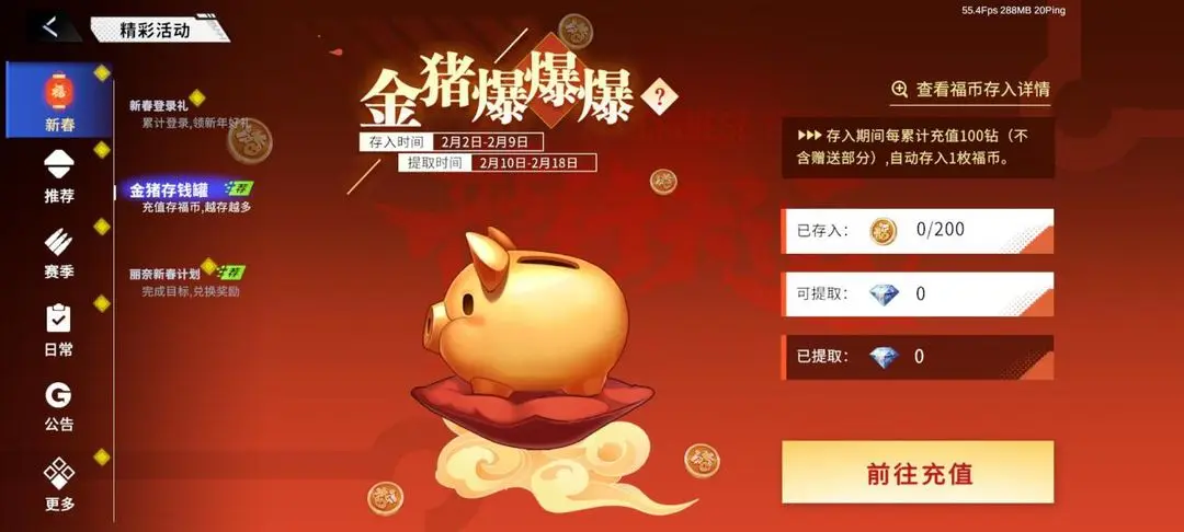 活动内容:活动开启后,存入期间(2月2日-2月9日)累计充值钻石可获得福币。提取期间(2月10日-2月18日)可前往“金猪爆爆爆”活动页面使用福币兑换/取出钻石。