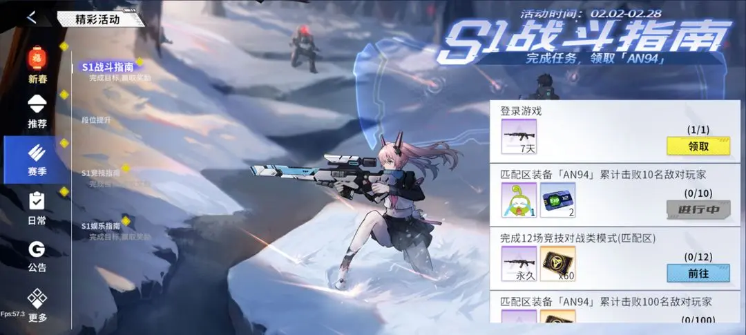 活动内容:活动期间完成S1战斗指南,可领取奖励包含主武器「AN94」、武器皮肤「AN94(红)」、表情-哭哭、补给黑卡等奖励。