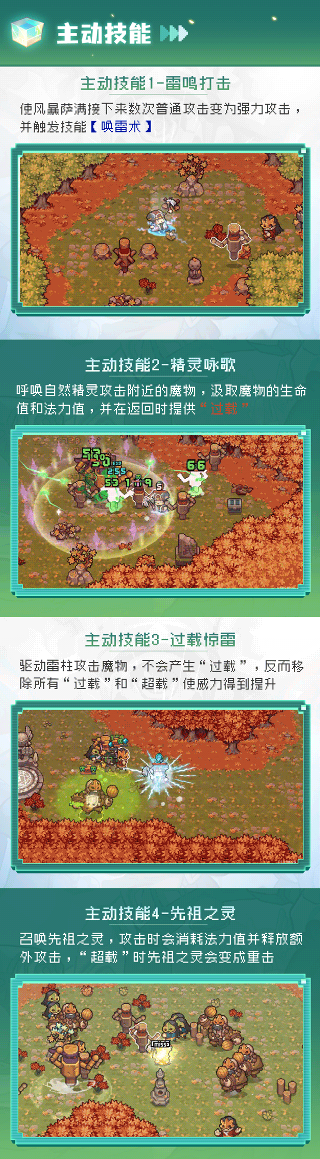 开头先呼唤【先祖之灵】来协助进攻,再使用【雷鸣打击】让自身的普通攻击附带【唤雷术】,同时积攒“过载”,然后再发动【精灵咏歌】对魔物造成毒素伤害,加快“过载”的积攒速度,当变成“超载”时,看准时机释放【过载惊雷】消耗身上的“超载”,让雷柱伤害最大化,emmmm.....魔物都焦了呢!
