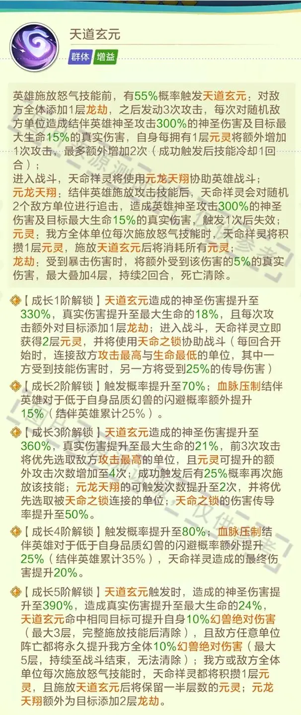 一是【天道玄元】,依靠英雄怒气前释放幻兽技能。这是幻兽的主要输出方式,对敌方造成3次神伤并带有最大生命值的真伤。不同于其他幻兽一次性输出,该技能是多次输出,可以命中多个单位,也可以命中1个单位,对PVE战斗是比较优秀的输出伙伴。【天道】成功释放后,还会主动给敌方添加1层【龙劫】,使得对方受到暴击的时候额外受到伤害,提高了暴击伤害的收益效果。