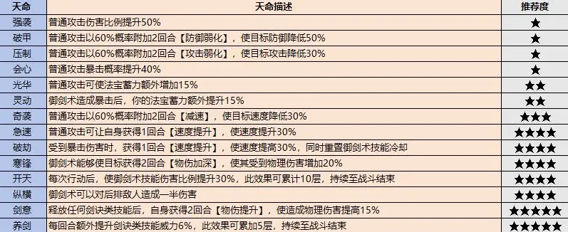 剑修具有与生俱来的强大输出能力,因此非常适合作为输出弟子。根据灵根的不同,剑修的培养方向也会有所差异。天命对输出也有一定的影响,这里附上别的祖师总结的天命盘点。需要注意的是养剑的效果仅作用于剑诀,所以对于一些热门的功法,如煞刑战帖等,可以不用过分追求养剑天命。