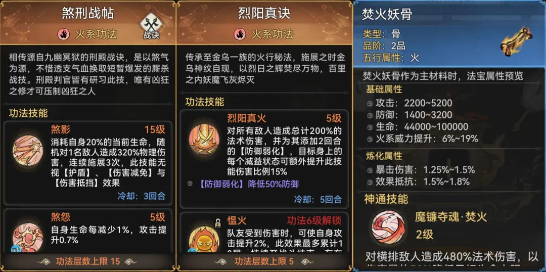 而对于火系剑修来说,目前的功法搭配最合适的无疑是煞刑战帖+烈阳真诀,烈阳真诀可以通过锁妖塔逐渐获得。前期的时候,焚空剑诀也是十分不错的过渡功法。由于煞刑战帖和烈阳真诀均不属于剑诀,所以火系剑修可以不必过分追求天命。法宝上必选焚火妖骨或者火铜来进一步提高火系输出。
