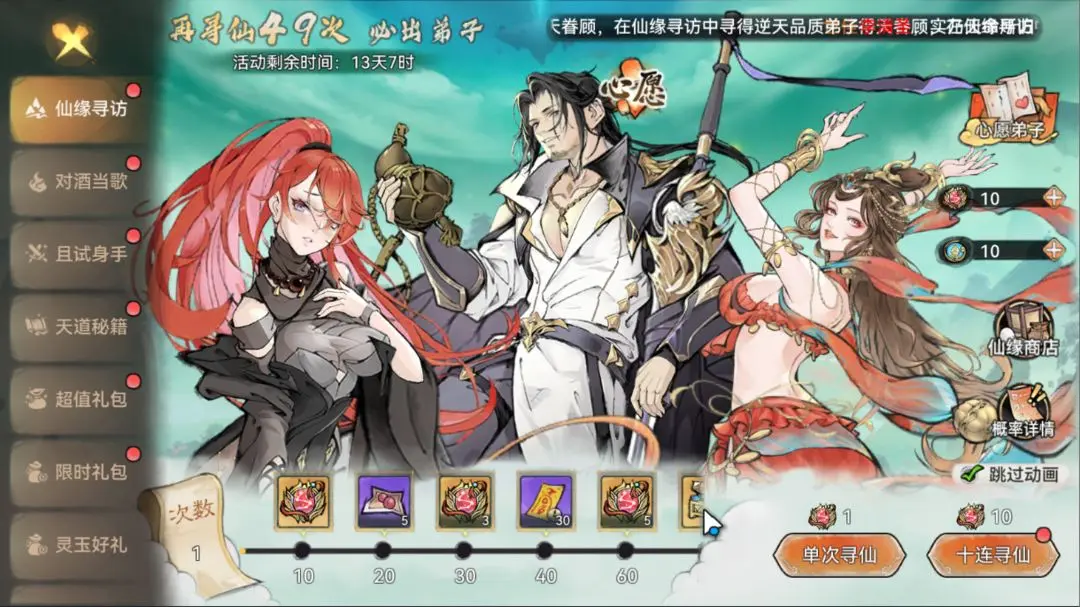 首先,还是关注仙缘寻访,前期仙玉的主要用途都是抽取这里的活动弟子,推荐顺序李清圣>秦冰>唐蝶衣。